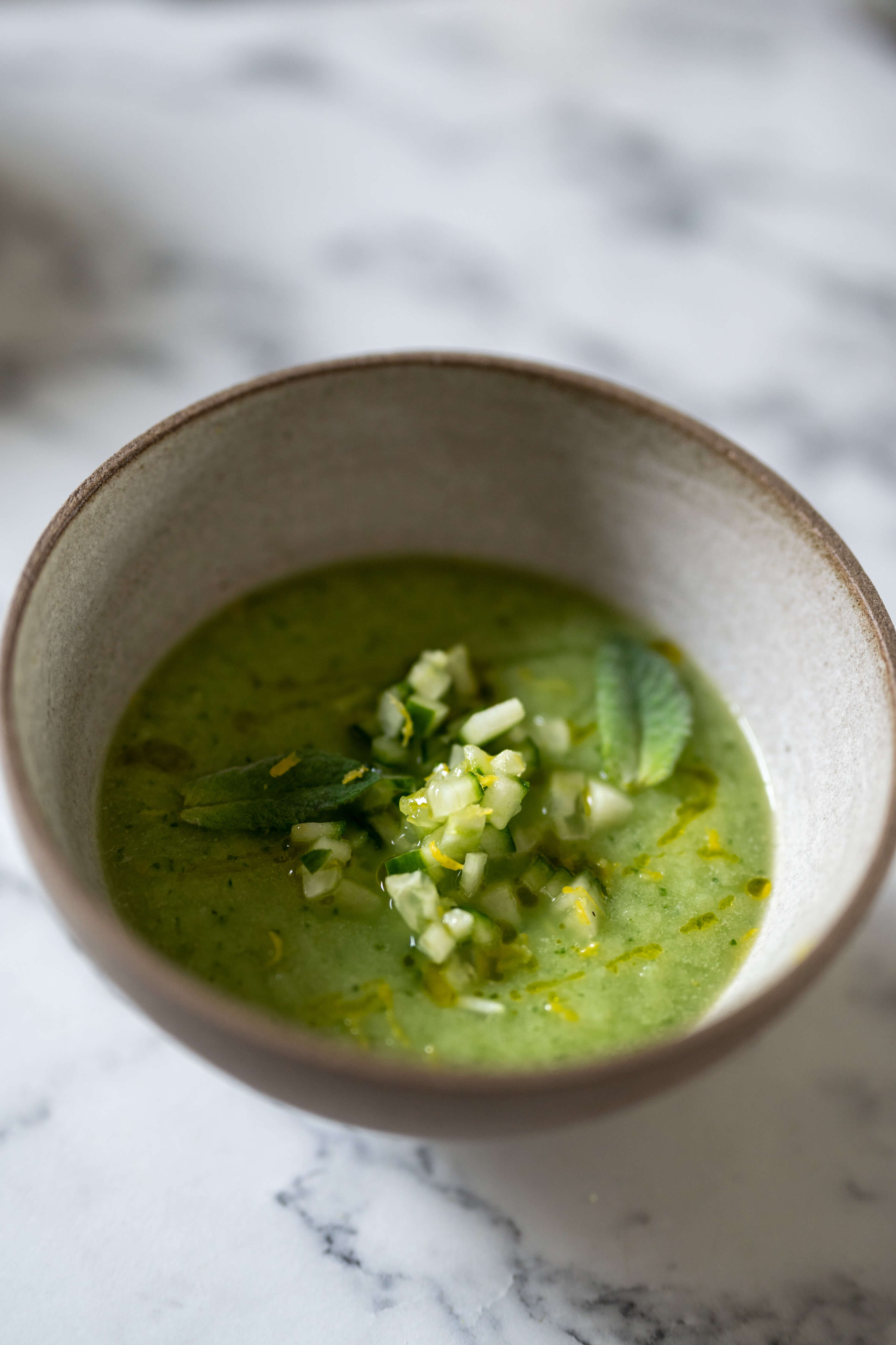 - Wlewamy do miseczek, polewamy resztą oliwy, ozdabiamy pokrojonym w kosteczkę ogórkiem, listkami mięty i skórką z cytryny.