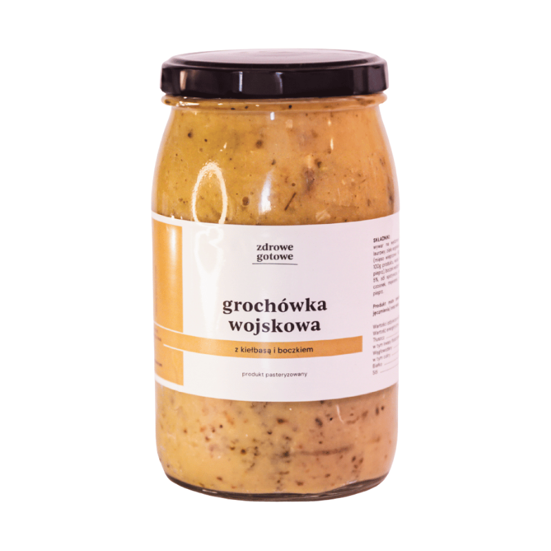 Grochówka wojskowa z kiełbasą i boczkiem to klasyczne, treściwe danie inspirowane tradycyjną kuchnią polską. Przygotowana z łuskanego grochu, aromatycznych warzyw oraz wysokiej jakości wędzonej kiełbasy i boczku, stanowi idealny wybór na sycący obiad. Gęsta, rozgrzewająca i pełna smaku, jak z wojskowego kotła – wystarczy podgrzać i cieszyć się domowym, solidnym posiłkiem. Bez sztucznych dodatków, konserwantów i zbędnych polepszaczy. Świetna na chłodne dni, biwak, działkę lub szybki obiad w domu. Tradycyjny smak, który zawsze się sprawdza.