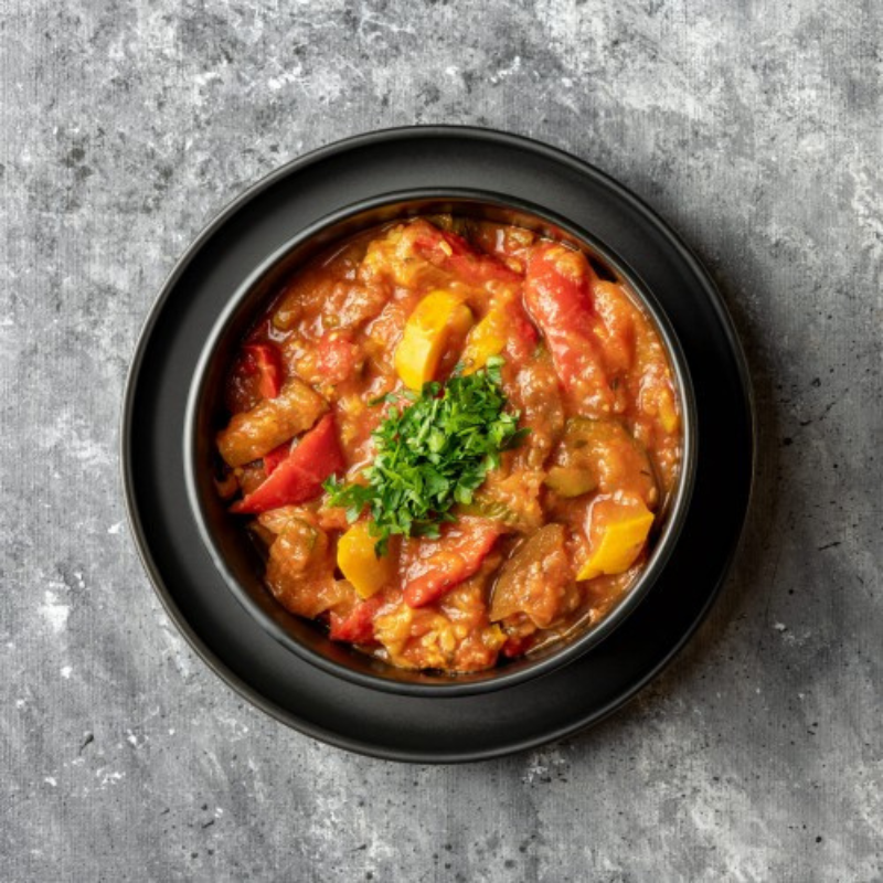 Czerwona soczewica, bakłażan, cukinia, papryka, pomidory, cebula, czosnek, świeża bazylia, chili, tymianek, sól, pieprz