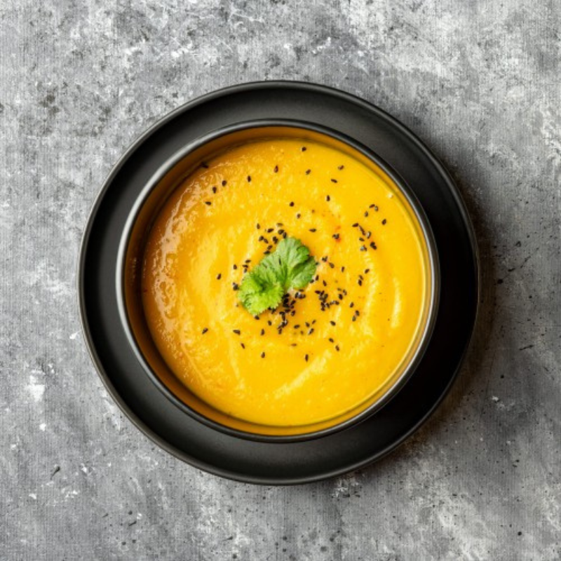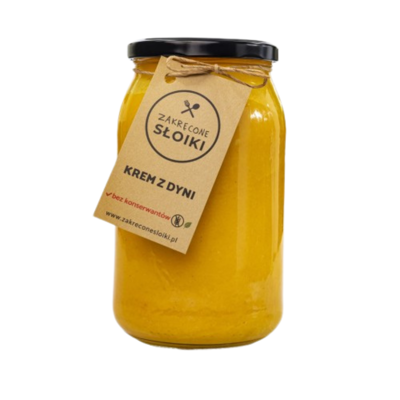 Aksamitna zupa krem z dyni z imbirem i mlekiem kokosowym to wyjątkowo aromatyczne, wegańskie danie, które rozgrzewa i syci jednocześnie. Główną rolę gra pieczona dynia, której naturalna słodycz doskonale łączy się z korzenną nutą świeżego imbiru i delikatną ostrością czosnku oraz pieprzu cayenne. Całość dopełnia mleko kokosowe, które nadaje zupie kremowej konsystencji i egzotycznego charakteru. Doprawiona solą, białym pieprzem oraz oliwą z oliwek, gotowana na aromatycznym bulionie warzywnym – jest idealnym wyborem na szybki obiad lub lekką kolację. W 100% roślinna, bez sztucznych dodatków i konserwantów. Gotowa do podgrzania – smakuj zdrowo, naturalnie i bez kompromisów!